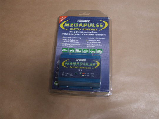 Funktionsweise: Batterien enthalten Platten aus Blei und Bleioxid, die von einer Schwefelsäure-Wasser-Mischung umgeben sind. Entlädt sich die Batterie durch Stromentnahme, so entsteht Bleisulfat. Bei regelmäßiger und vollständiger Aufladung der Batterie wird das Bleisulfat wieder gelöst (zu Blei und Schwefelsäure) und die Ladekapazität bleibt erhalten. Geschieht dies nicht unmittelbar nach der Entladung, verfestigt sich das Bleisulfat zu großen, festen Kristallen an den Batterieplatten, die nicht mehr gelöst werden können. Dies nennt man Sulfatierung. Die Ladekapazität sinkt mit zunehmender “Sulfatierung”, bis sich die Batterie nicht mehr aufladen lässt. Über 80 Prozent der Batterien büßen dadurch ihre Funktionsfähigkeit ein. Mit dem Megapulse behandelt, lassen sich durch Sulfatierung geschädigte Batterien wieder vollständig aufladen und auch tot geglaubte Batterien werden dadurch wieder einsatzfähig gemacht. Das kleine Gerät wird für eine bestimmte Zeit auf die Batterie montiert und an die Pole angeschlossen. Durch gleichmäßige, hochfrequente Stromimpulse bilden sich die Kristalle auf den Batterieplatten zurück zu ihrer ursprünglichen amorphen und schwammigen Struktur ähnlich einer neuen Batterieplatte. Die Batterie wird dadurch wieder ladefähig: Ladespannung, Säuredichte und Kälteprüfstrom steigen deutlich messbar an. Altersschwache Bleisäure- und Gel-Batterien lassen sich mit Megapulse wieder reaktivieren und ihre Lebensdauer deutlich erhöhen. So lässt sich ein kostenintensiver Neukauf sparen und der Bleiakku wird verlässlicher sein und länger leben.